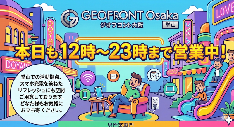 店内は男性専用のインターネットカフェ系休憩スペースです。ドリンクを飲みながら、パソコンやiPadのご利用、GAY関連の雑誌・コミック・文庫の閲覧など、ゆったりとお過ごし頂けます。 休憩や暇つぶし、待ち合わせなどにもご利用いただけ、落ち着いた空間をご用意しております。堂山での活動拠点や待ち合わせ、スマートフォンの充電も兼ねたリフレッシュにも最適です。 18歳以上の男性であれば、出会いや休憩やクルージングなど多目的にご利用いただけます。「GEOFRONT(ジオフロント)」という店名は、地下空間・地下都市という意味で、当店が地下1階にあることに由来しています。 Geofront is a men-only internet café and relaxation space in Doyama, Osaka. Guests can relax while using PCs or iPads, free Wi-Fi, reading magazines, comics, and manga, and enjoying free soft drinks. It is a comfortable place to take a break, wait for friends, charge your smartphone, or relax before going out. Perfect for resting before or after cruising or meeting people in the Doyama area. All men aged 18 and over are welcome. ![]() |